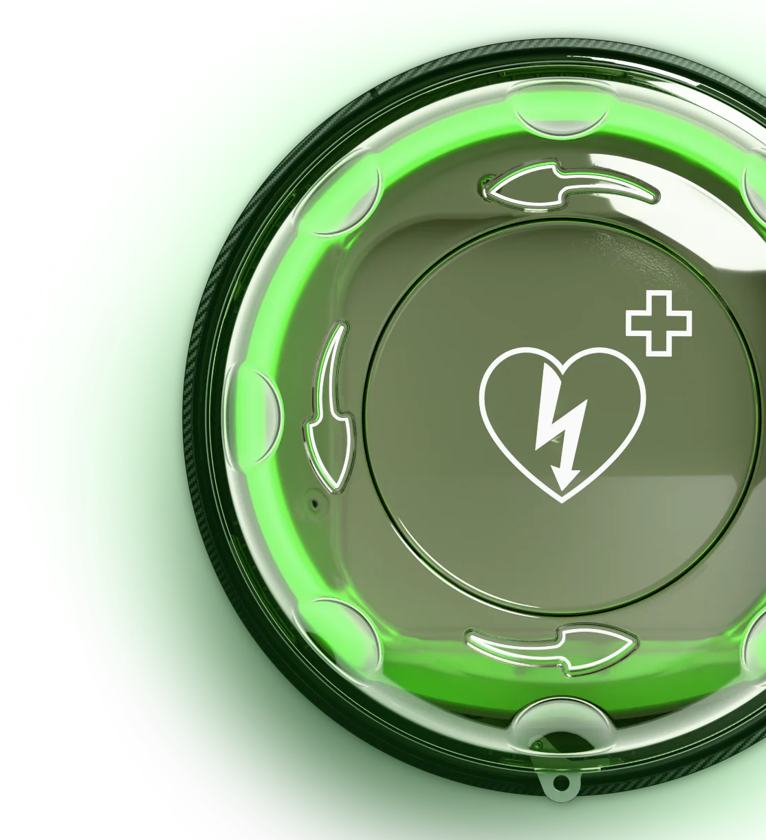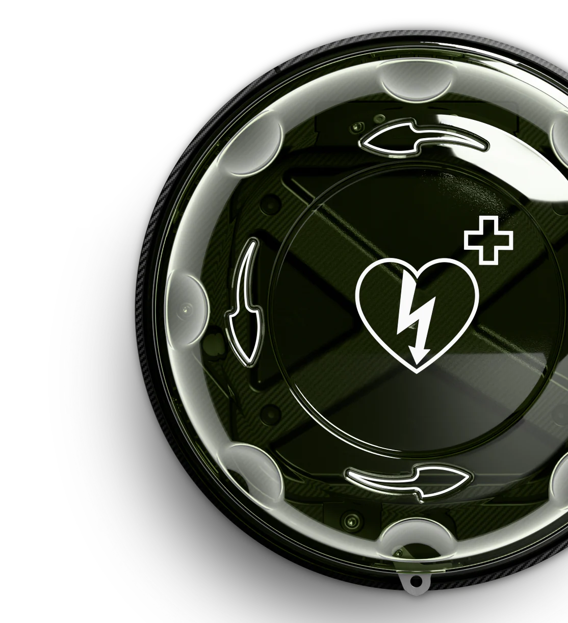 Its distinctive round shape and recognizable LED lighting, make it highly visible and findable, during day and night. The transparent AED cover comes with a large AED-logo, 4 directive and highlighted arrows for guidance and 8 indents for maximum grip in all weather conditions.